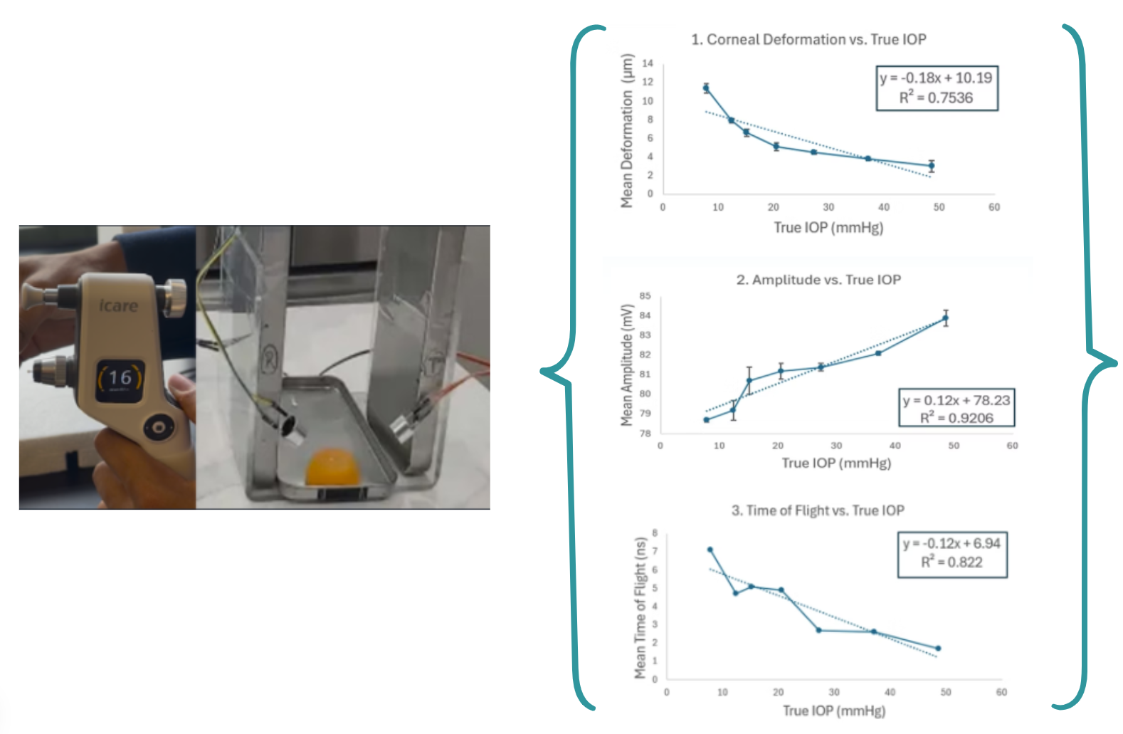 20+ parameters will be experimentally extracted from the reflected ultrasound signal, which will correlate to IOP. The experimental correlation of three of these parameters is shown below.